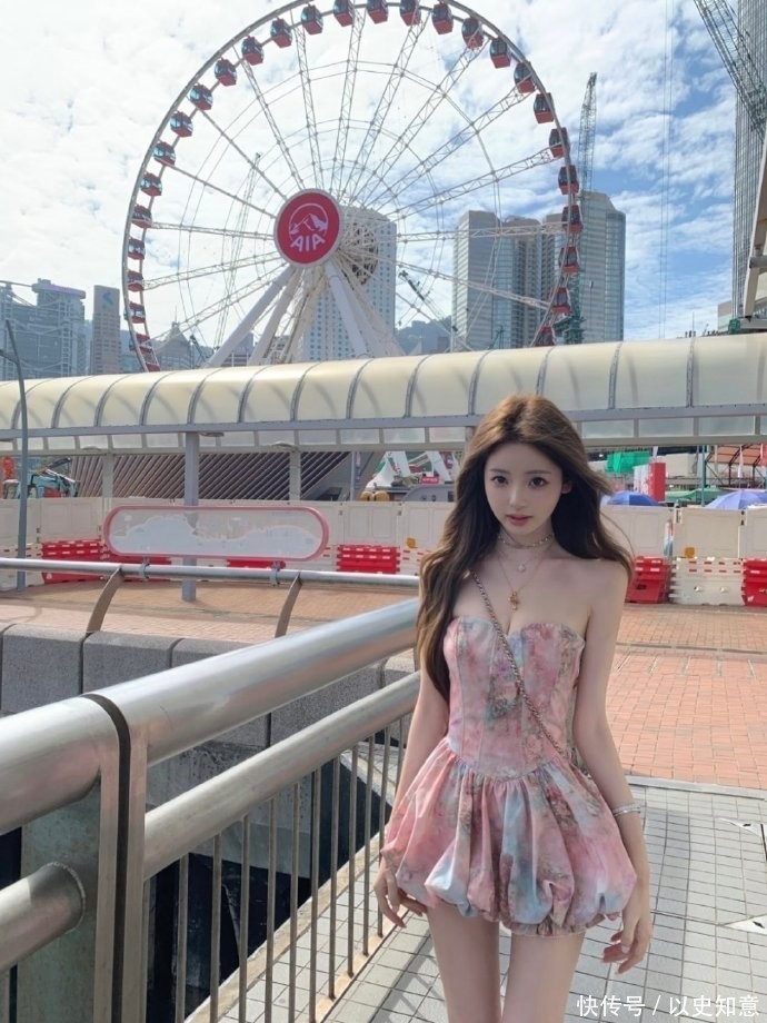 另一套造型中,她身着粉底白碎花抹胸式花苞裙登场。裙身采用渐变晕染工艺,花瓣边缘由浅樱粉自然过渡至奶白,柔焦质感扑面而来;抹胸剪裁勾勒出流畅锁骨与修长颈线,高腰线+蓬松短裙摆的设计巧妙拔高视觉重心,为娇小身形注入轻盈跃动感。
