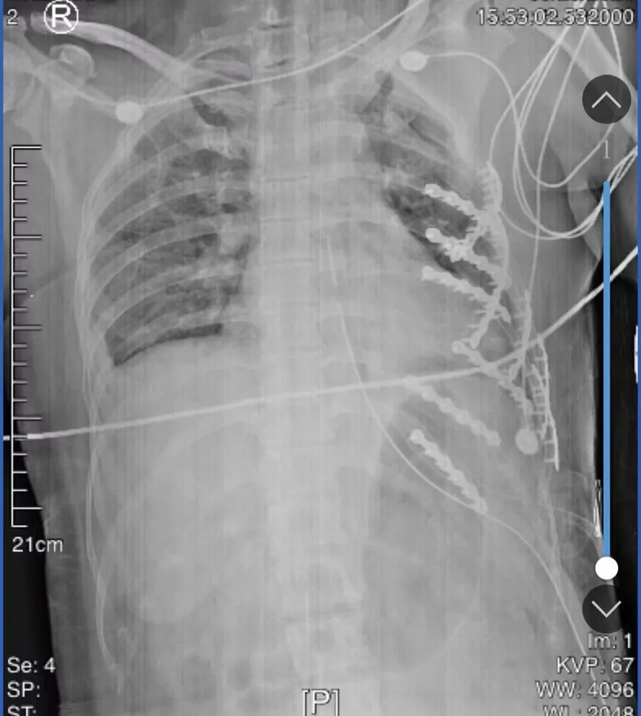 术前影像检查结果显示,患者胸部因遭受剧烈挤压,导致胸壁严重软化塌陷,胸腔有大量积液。张己为医生介绍:“人体胸腔共有24根肋骨,患者断了20根,尤其左侧伤情最为严重——第1至第12根肋骨全部骨折,部分肋骨呈多处断裂,错位明显,骨折碎片已刺破壁层胸膜,并深深扎入左肺上下叶,左侧和右侧肋骨共有40多处断裂。”
